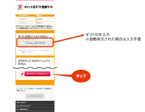 - STEP3 贈られたポイント@ギフト(dポイント)の「ギフトID」を用意します。