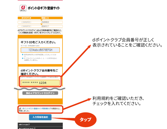 - STEP4 登録サイトにアクセスして、「ギフトID」と「dポイントクラブ会員番号」を登録します。