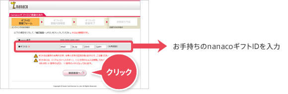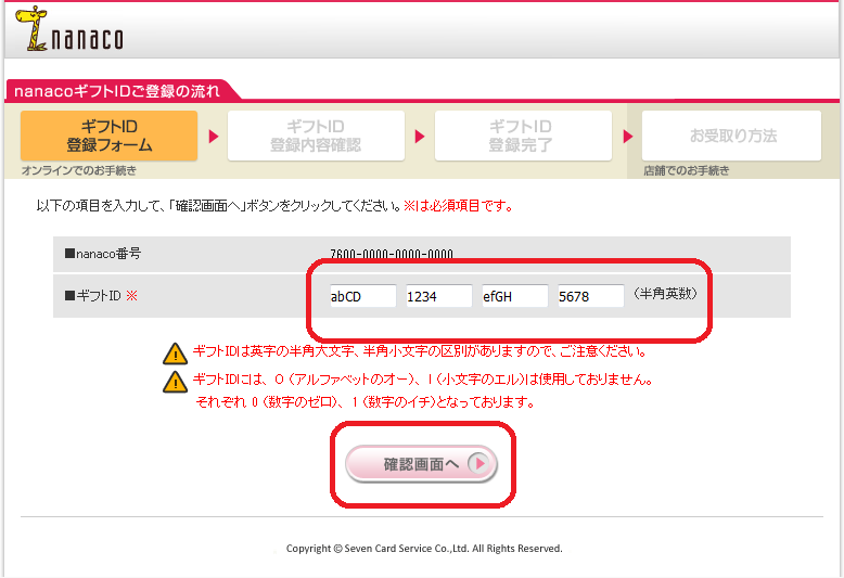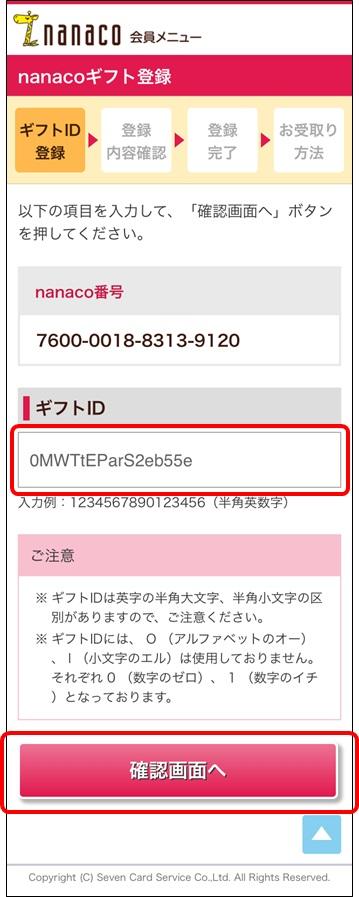 - 4.nanacoギフトIDを正しく入力し、「確認画面へ」ボタンを押す