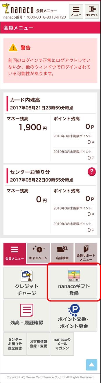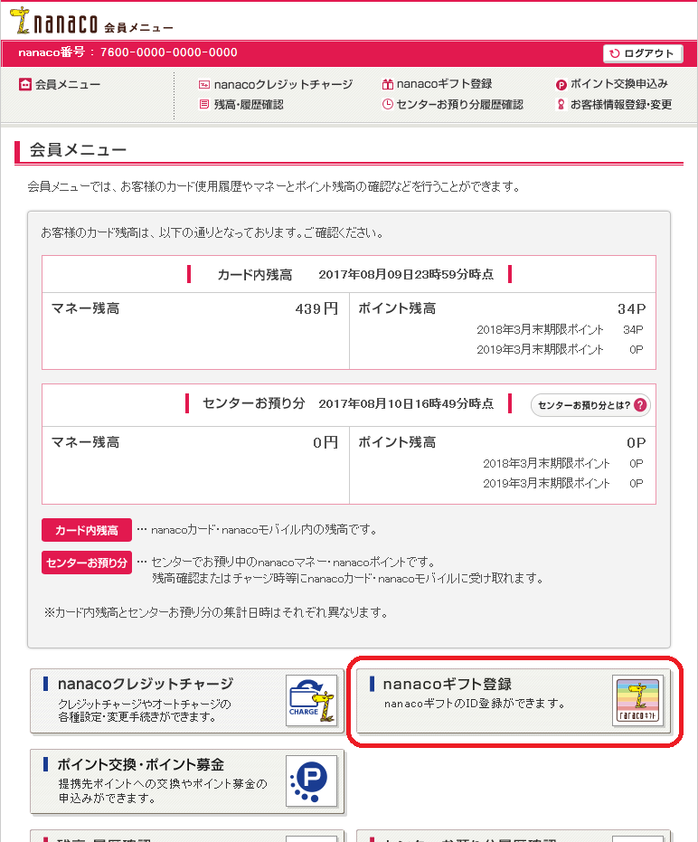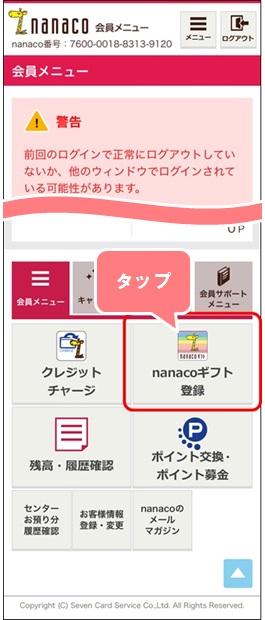 - 2.会員メニューの「nanacoギフト登録」ボタンを押す