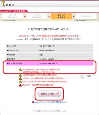 登録完了時に表示される『受取可能日』を必ずご確認ください。 - ※「nanaco」入会当日にnanacoギフトIDを登録した場合は『受取可能日』に関わらず、翌々日の朝6時以降に「nanaco」の受け取りが可能になります。