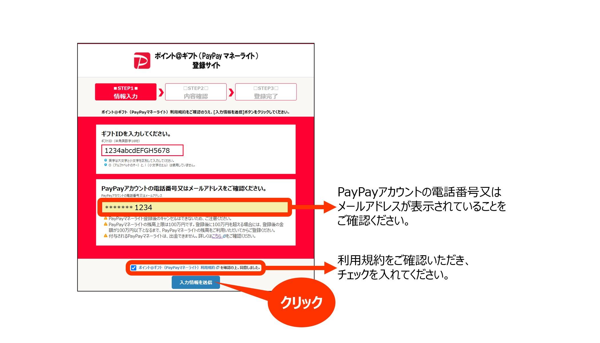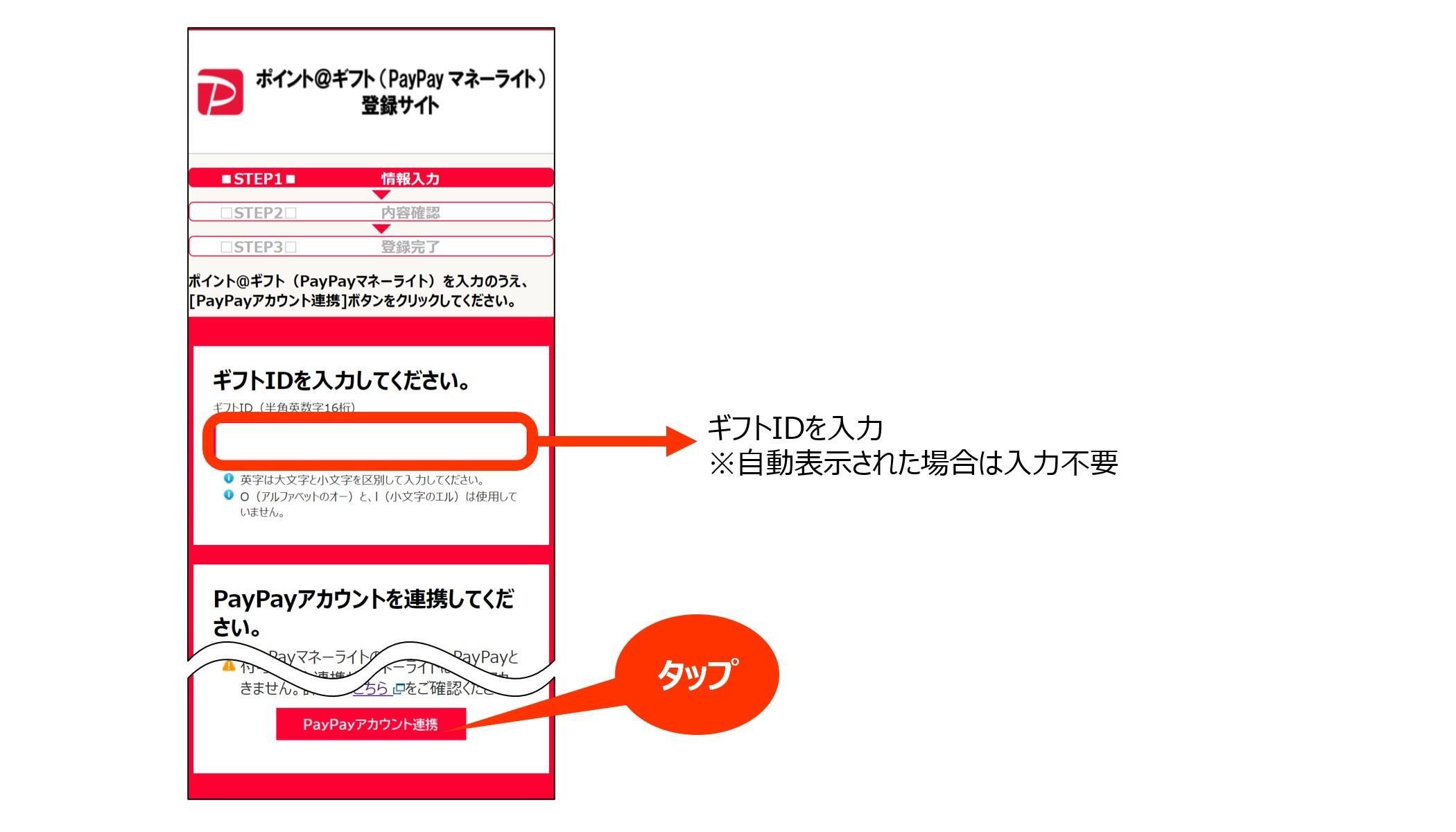 - STEP2 登録サイトにアクセスして、PayPayアカウントを連携の上、「ギフトID」を登録します。